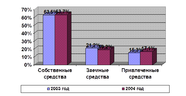 Таким образом, в структуре активов предприятия наибольший удельный вес занимают труднореализуемые активы. Причем их доля выросла на 0,1%. На втором месте медленнореализуемые активы (35,2% - в начале 2004 г. и 35,1% - в конце 2004 г.). Наиболее ликвидные активы составляют самый маленький процент (0,8% - в начале 2004 г. и 0,6% - в конце 2004 г.). Так, доля наиболее ликвидных активов снизилась на 0,2%.