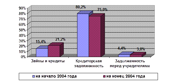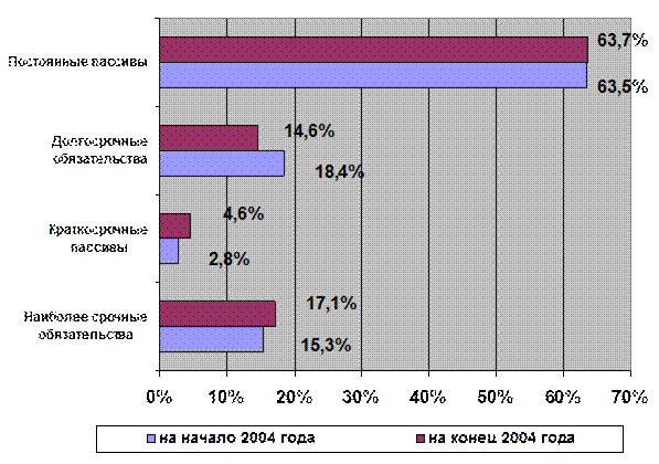В структуре пассивов предприятия наибольший удельный вес имеют постоянные пассивы, их удельный вес к концу 2004 г. по сравнению с началом того же года вырос на 0,2%. Наименьший процент имеют краткосрочные пассивы (2,8% - в начале 2004 г. и 4,6% - в конце 2004 г.).