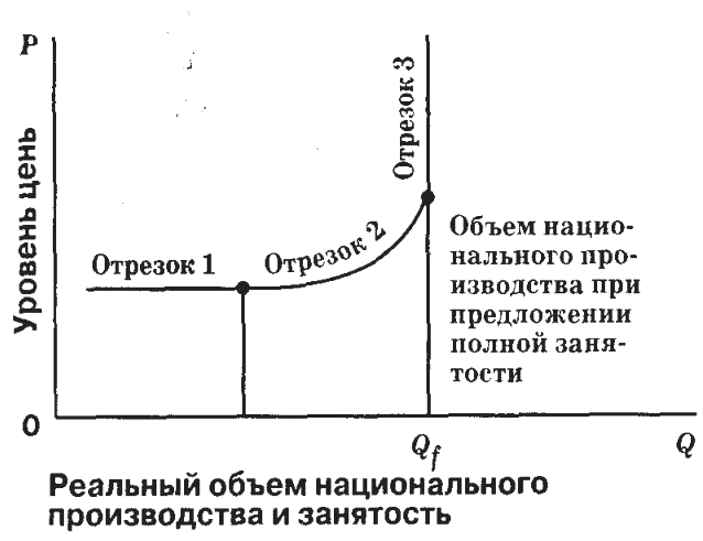 При постоянном уровне цен (отрезок 1) предложение представляет собой горизонтальную линию. Номинальный и реальный ВНП увеличиваются в одинаковой степени. При росте спроса (отрезок 2) экономика приближается к полной занятости и более полному использованию имеющихся ресурсов. При «чистой» инфляции (отрезок 3) номинальный ВНП возрастает, причем иногда быстрыми темпами, а реальный ВНП остается неизменным.