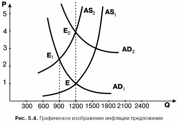 Повышение издержек на единицу продукции в экономике сокращает прибыли и объем продукции, который фирмы готовы предложить при существующем уровне цен. В результате уменьшается предложение товаров и услуг в масштабе всей экономики. Это уменьшение предложения, в свою очередь, повышает уровень цен. Следовательно, по этой схеме издержки, а не спрос взвинчивает цены, как это происходит при инфляции спроса.