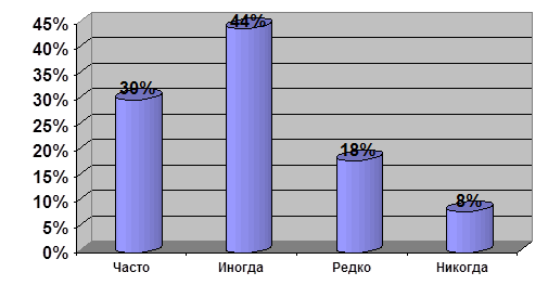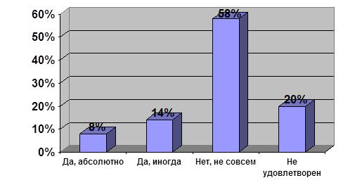 Данные Рисунка 2.1. свидетельствуют о том, что преобладающее большинство респондентов не совсем удовлетворены микроклиматом в семье. Так ответили 58% от общего числа опрашиваемых. В беседе респонденты отмечали, что причин тому может быть несколько. Основными из них являются: отсутствие «сильного плеча», непослушание детей, недостаток материальных средств. Только 8% респондентов ответили, что они абсолютно удовлетворены микроклиматом в семье.