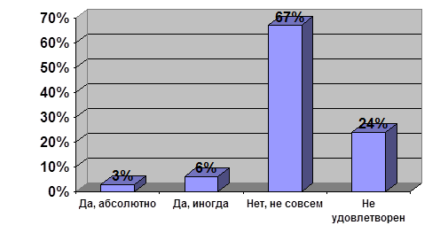 Подытожив полученные данные по второму вопросу анкеты, касающемуся удовлетворенности работой, можно сказать, что в целом полностью удовлетворены работой лишь малая доля опрошенных. В основном респонденты не восторженно отзываются о своих профессиональных обязанностях. Работа для, в большинстве своем, именно работа, а не удовольствие.