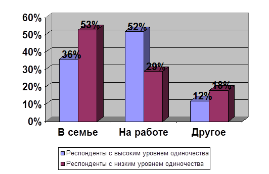 Таким образом, мы выяснили, что респонденты с высоким уровнем одиночества большее всего чувствуют себя одинокими на работе. В меньшей степени у них выражено одиночество, связанное с семейными проблемами. Респонденты с низким уровнем одиночества, напротив, более одиноки именно в семье.