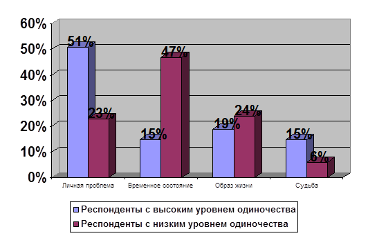 Данные Рисунка 2.6. свидетельствуют о том, что респонденты с высоким уровнем одиночества склонны относиться к одиночеству как к личной проблеме. Они склонны зацикливаться на нем и отстраняться от внешнего мира. Приблизительно 1/7 часть опрошенных с высоким уровнем одиночества, считают одиночество судьбой, которая им предначертана.