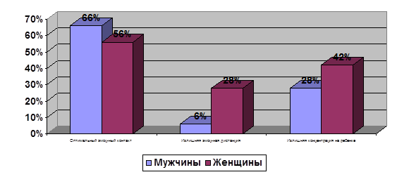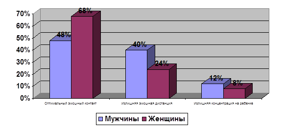 Как в многодетных, так и в немногоденых семьях преобладает оптимальный эмоциональный контакт с детьми. Однако, если в многодетных семьях все же имеет место излишняя дистанцированность родителей от ребенка, особенно проявляющаяся у отцов, то в немногодетных семьях, напротив, присутствует излишняя концентрация на ребенке, особенно проявляющаяся со стороны матери.