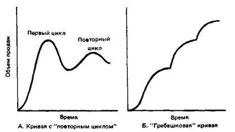 Хотя представленная здесь кривая жизненного цикла товара типична, она не всегда имеет такой вид. Одним из часто встречающихся вариантов является кривая «с повторным циклом» (рис. 2а). Второй «горб» сбыта вызывается мероприятиями по стимулированию сбыта, проведенными на этапе упадка товара. Еще одной разновидностью является «гребешковая» кривая (рис. 2б), состоящая из последовательного ряда циклов, порожденных открытием новых характеристик товара, новых способов его использования, появлением новых пользователей, Так, например, кривой «гребешкового» вида характеризуется сбыт нейлона, что объясняется появлением с течением лет множества новых сфер его использования - парашюты, чулки и белье, рубашки, ковровые покрытия [2].