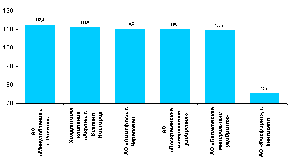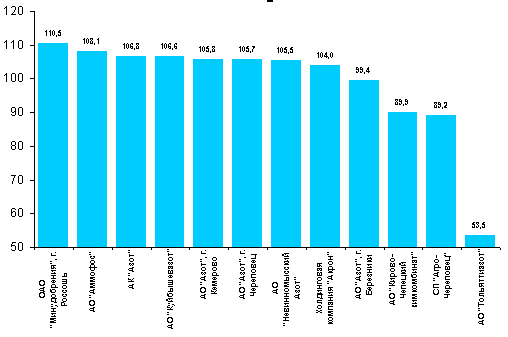 Рис. 3 Динамика производства азотных удобрений основными производителями за 9 месяцев 2001 г., в % к 9 месяцем 2000г.