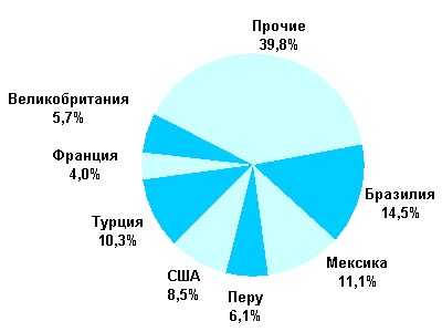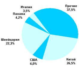 Рис. 8 Географическая структура экспорта фосфорных удобрений в 1 полугодии 2001 г., %