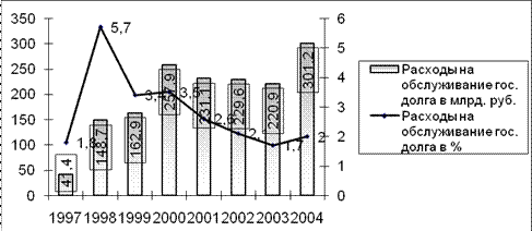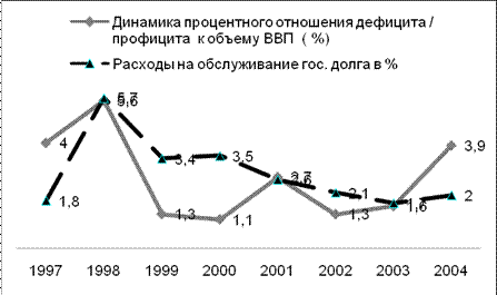 Взаимосвязь расходов на обслуживание государственного долга за период с 1997 по 2004гг. и трансформации дефицита федерального бюджета в профицит