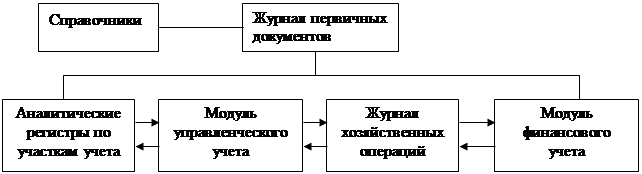 Модуль управленческого учета позволяет вести учет в суммовом количественном выражении для участков учета основных средств и нематериальных активов, учета товарно-материальных ценностей (ТМЦ) МБП, учета готовой продукции (товаров - для торговых предприятий расчетов по оплате труда. Набор этих участков можно менять исходя из потребностей пользователей. Основными учетными регистрами данного модуля являются аналитические регистры по участкам учета - журнал учета первичных документов, журнал учета товарно-материальных ценностей, журнал учета хозяйственных операций.