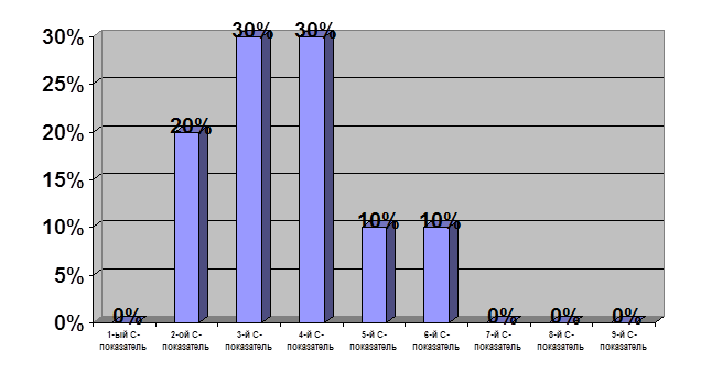 Таким образом, данные, представленные на рис. 1 и 2 свидетельствуют о том, что результаты ответов студентов-бюджетников занимают серединное положение по шкале С-показателей. Преобладающее большинство тестируемых можно отнести к людям, обладающим невысокой степенью уверенности в себе, в собственных силах (30% имеют 5-й С-показатель и столько же 6-й). Среди оставшихся обследуемых 30% относятся к людям уверенным в себе (10% - 3-й С-показатель и 20% - 4-й С-показатель) и 10% - к неуверенным в себе, чей С-показатель равен семи.