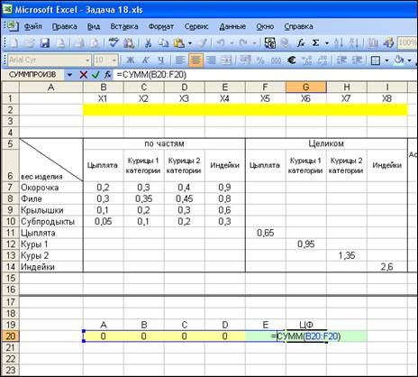 - В ячейке G20 получим сумму максимальной прибыли от реализации продукции; в ячейках B2, C2, D2, E2 – количество изделий для продажи по частям; в ячейках F2, G2, H2, I2 – количество изделий для продажи целиком: