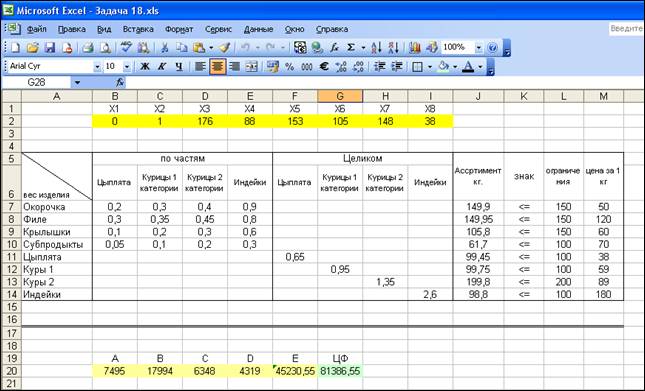 50*(0,2*Х1+0,3*Х2+0,4*Х3+0,9*Х4) – для окорочков (А);