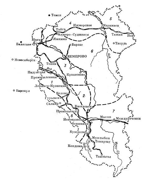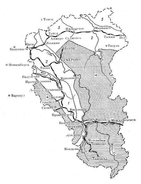 Орографически область представляет собой две котловины, окаймленные с трех сторон горными массивами и соединяющиеся на севере с Западно-Сибирской низменностью. Большая из котловин прорезана с юга на север р. Томью и окружена с северо-востока Кузнецким Алатау, с юга — Горной Шорией и с юго-западной стороны — Салаирским кряжем. Меньшая котловина — вдоль р. Кии, ограниченная с северо-востока, юга и юго-запада отрогами Кузнецкого Алатау. По геоморфологическим признакам это горно-равнинная местность, в пределах которой выделяется 8 районов (рис. 1). Кузнецкая котловина граничит на юго-западе с Салаирским кряжем, а на юго-востоке — с Горной Шорией. На северо-востоке она постепенно переходит в Притомскую южную возвышенную сильно расчлененную равнину и Среднетомскую расчлененную равнину, которые в свою очередь на востоке и на северо-востоке окаймлены Кузнецким Алатау. На севере и крайнем северо-востоке области находятся Притомская северная возвышенность и Чулымская равнина.