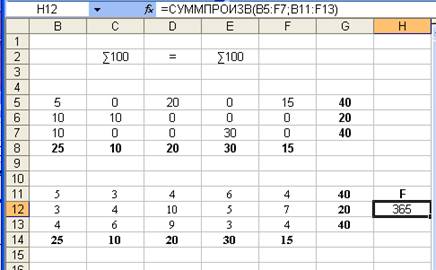 4. Назначение целевой функции Н12, соответствующей минимальным суммарным затратам на доставку груза представляет собой произведение удельных затрат на доставку груза. После решения задачи в данной ячейке будет находиться значение целевой функции. Запускаем Мастера функций (категория математические, СУММПРОИЗВ) и указываем адреса массивов, элементы которых обрабатываются этой функцией.