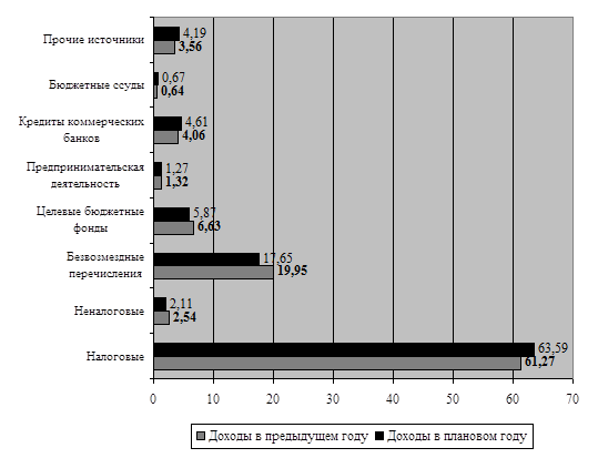 1. Основными доходами данного бюджета являются налоговые поступления и безвозмездные перечисления. Доля налоговых поступлений в плановом году увеличилась на 23,5%, темп роста безвозмездных перечислений равен 5,3%. Положительной тенденцией является увеличение поступлений в бюджет от предпринимательской деятельности. Темп роста в этом случае составил 15,3%. На 1% снизилось поступление в бюджет неналоговых доходов. Однако это не оказало существенного влияния на состояние бюджета данного субъекта федерации.
