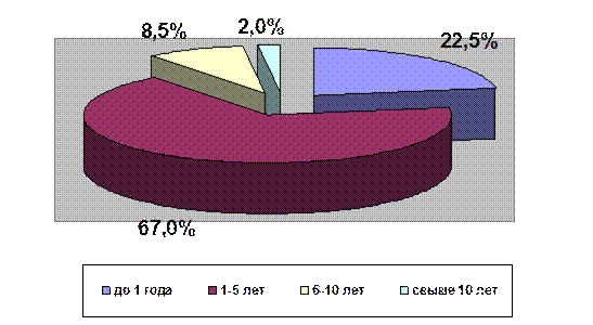 Так, из данных рис. 3.11 следует, что наибольшую долю в структуре кредитного портфеля по срокам кредитования занимают кредиты сроком на 1-5 лет (67,0%), затем кредиты, выданные сроком погашения до 1 года (22,5%). Наименьший удельный вес имеют кредиты, выданные сроком более, чем на 10 лет (2,0%).