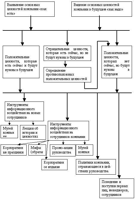 Исходя из текущих ценностей компании и видения будущих ценностей можно получить три основные группы: положительные ценности, которые есть сейчас и будут нужны в будущем; отрицательные ценности, которые есть сейчас, но не будут нужны в будущем; положительные ценности, которых нет сейчас, но они будут нужны в будущем. К отрицательным ценностям, которые появились в компании в последние годы и грозили ей в будущем можно было отнести: безынициативность сотрудников, боязнь менеджеров принимать решение, низкая самоотдача сотрудников. Согласно схеме для выявленных отрицательных ценностей необходимо найти противоположные ценности. Например, инициатива сотрудников, умение менеджеров принимать решения, повышение производительности труда сотрудников. Таким образом, для дальнейшей работы остаются только положительные ценности, которые нужно поддерживать и которые нужно сформировать.