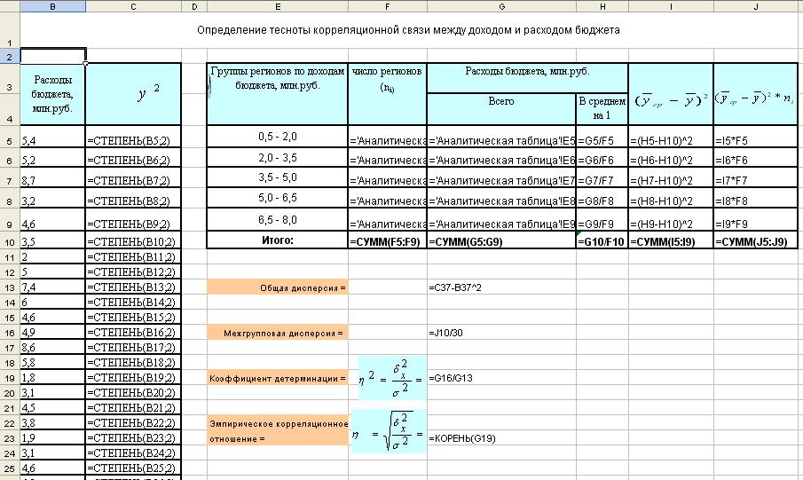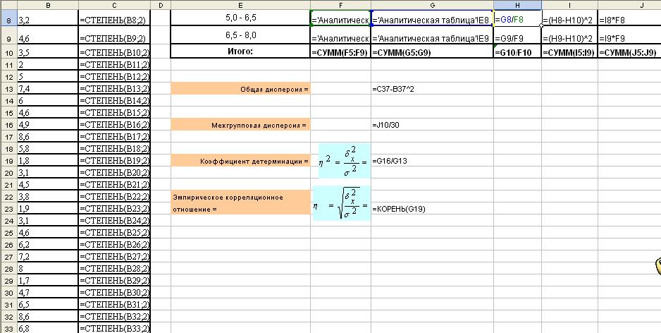 Таблица 11. Расположение на рабочем листе исходных данных и расчетных формул в формате Excel