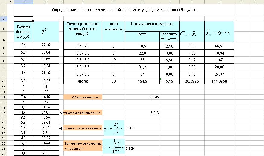 Расположение на рабочем листе Excel исходных данных и расчетных данных представлены в таблице 15 и 16.