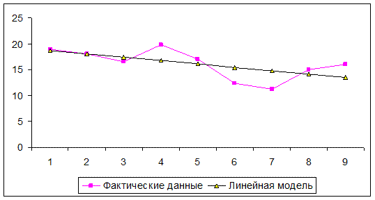 Величина относительной колеблемости уровней ряда около тренда, значение коэффициента вариации, а также графическое изображение фактической динамики дефицита государственного бюджета и тренда показывают, что выравнивания достаточно точно воспроизводит фактические данные. Таким образом, дефицит государственного бюджета в 2005г. имел тенденцию к понижению.