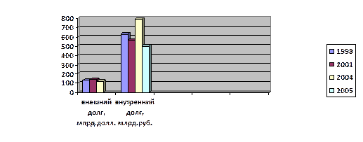 На начало 2004г. общий объём государственного внешнего долга (включая обязательства бывшего СССР, принятые РФ) прогнозируется в сумме 119,1 млрд. долл. США, выплаты по кредитам правительств иностранных государств – 53,8 млрд. долл., ценные государственные бумаги РФ, выраженные в иностранной валюте, - 44,7 млрд. долл. Величина внутреннего долга в 2004 г. увеличилась на 195 млрд. руб., или 6,5 млрд. долл.: на 1.01.2004 г. она составит 792 млрд. руб. и на конец 2004 г. – 988,1 млрд. руб.