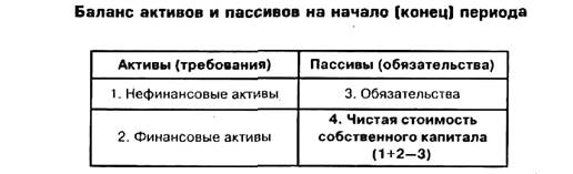Расчет национального богатства и чистой стоимости собственного капитала для каждой хозяйственной единицы и секторов экономики отражается в специальных таблицах — в балансе активов и пассивов (табл. 1), который составляется по состоянию на начало и конец периода.