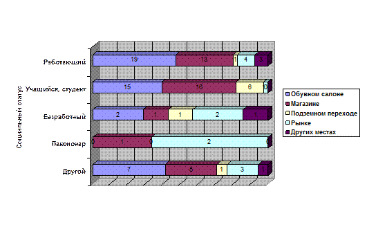 Анализируя зависимость предпочитаемой цены от материального положения покупателей, можно отметить, что для покупателей, которым не хватает денег на питание, оптимальная цена на: сапоги - 1300 руб., полусапожки - 900 руб., ботинки - 700 руб.; для покупателей которым хватает денег только на питание - сапоги - 1600, полусапожки - 1300, ботинки - 1200; для покупателей, которым хватает денег на питание +одежду - сапоги - 2500, полусапожки - 2400, ботинки - 2300; хватает денег на питание +одежду + бытовые товары - сапоги - 3200, полусапожки - 2900, ботинки – 2500.