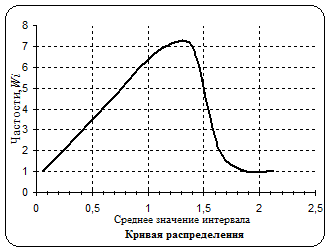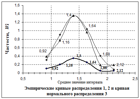 4. Кривой эмпирического распределения является кривая плотности распределения. По оси ординат графика функции этой кривой откладывают частости Wi , по оси абсцисс средне значения вариант представленного сгруппированного вариационного ряда.