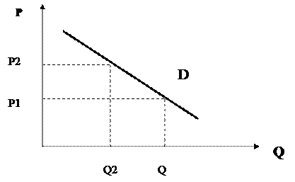 Кривая спроса показывает, какое количество товара будет продано на рынке в течение конкретного отрезка времени по разным ценам. В обычной ситуации спрос и цена находятся в обратно пропорциональной зависимости, т.е. чем выше цена, тем ниже спрос, чем ниже цена, тем выше спрос. Так что, подняв цену с Р1 до Р2 предприятие продаст меньшее количество товара.