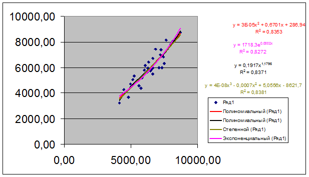Задача 5. Нахождение наиболее адекватного уравнения регрессии с помощью средств инструмента Мастер диаграмм. Построение для этого уравнения теоретической линии регрессии.