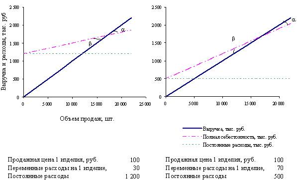 На рисунке отображены графики безубыточности для ООО Мясоконсервного комбината, выпускающего аналогичные изделия, реализуемые по одной и той же цене. Разница заключается в затратах на их производство: у одного изделия более высокие переменные, но более низкие постоянные издержки, у другого – наоборот. Неудивительно, что у изделия с более высокими фиксированными расходами график безубыточности сдвинут вверх. Критический объем продаж для первого предприятия составляет ≈17143 изделия (1200 / (100 – 30), а для второго ≈ 16667 изделий (500 / (100 – 70). После прохождения критической точки, предприятия полностью покрывают свои постоянные издержки и начинают получать операционную прибыль. Сравнивая между собой углы, под которыми пересекаются линии полной себестоимости и выручки (α), можно заметить, что для предприятия с низкими фиксированными расходами этот угол более острый. То есть, расширение зоны прибыли происходит у него значительно медленнее, чем у предприятия с более высокими постоянными затратами. Получается, что в данной ситуации высокий уровень фиксированных издержек является благом: он как рычаг усиливает влияние даже небольшого прироста объема продаж.