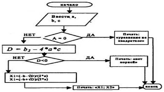 Так выглядит блок –схема решения квадратного уравнения вида: а"х2+Ь'х+с=0.