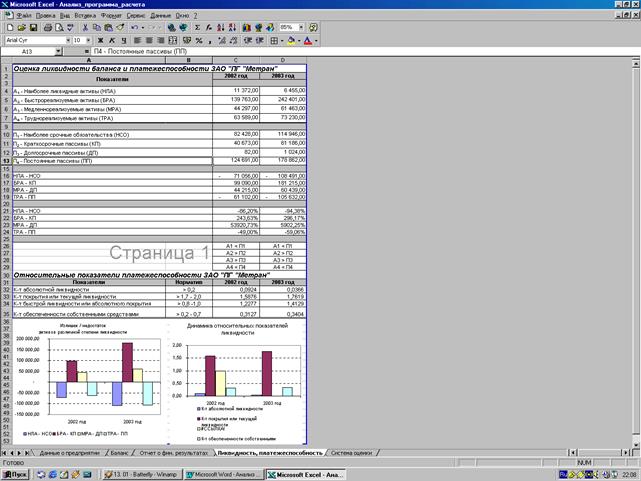 В Microsoft Excel была разработана программа, позволяющая автоматически производить расчеты ликвидности и платежеспособности, деловой активности и рентабельности предприятия.