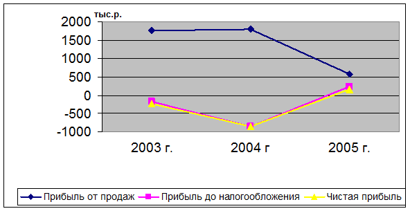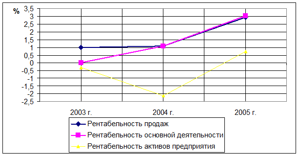 Рентабельность продаж в 2005 г. увеличилась по сравнению с 2003 г. в 2,9 раза и составила 2,95 %. Рентабельность основной деятельности выросла в 2005 г. в сравнении с 2003 г. на 2,05 %. Рентабельность активов предприятия с 2003 г. по 2004 г. находилась на отрицательном уровне, лишь по состоянию на конец 2005 г. она приняла положительное значение и составила 0,75 %, что свидетельствует о неэффективности деятельности, большом уровне затрат, неэффективной финансовой, маркетинговой политике.