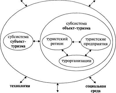 В основе системы туризма лежат две субсистемы: субъект туризма и объект туризма. Под субъектом туризма понимается участник туристского мероприятия, или турист, который ищет возможности удовлетворения своих потребностей путем получения специфических туристских услуг. Названые услуги предоставляются объектом туризма. Под объектом туризма понимается все то, что может стать для субъекта туризма (туриста) целью путешествия. Это может быть туристский регион широкой специализации со всеми его туристскими структурами.