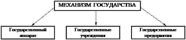 На наш взгляд, понятие "механизм государства" более полно раскрывает содержание материальных и организационных средств реализации государственной власти. Он может использоваться в широком и узком смысле. В широком смысле механизм государства включает в себя всю совокупность государственных органов, посредством которых осуществляются задачи и функции государства. При таком понимании механизм государства состоит из государственного аппарата, государственных учреждений и государственных предприятий.[2]
