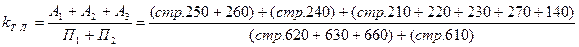 где L1, L2, L3 – весовые коэффициенты, учитывающие значимость средств с точки зрения сроков поступления и погашения обязательств (L1 = 1,0; L2 = 0,5; L3 = 0,5).