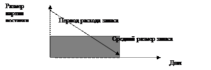 Для производственных запасов она состоит в определении оптимального размера партии поставляемого сырья и материалов. Чем выше размер партии поставки, тем ниже относительный размер текущих затрат по размещению заказа, доставке товаров и их приемке. Однако высокий размер партии поставки определяет высокий средний размер запаса — если закупать автомобильные запчасти один раз в два месяца, то средний размер его запаса составит 30 дней, а если размер партии поставки сократить вдвое, т. е. закупать автомобильные запчасти один раз в месяц, то средний размер его запаса составит 15 дней (см. рис. 6.). В этих условиях снизится размер текущих затрат по хранению запасов (обозначим этот вид текущих затрат по обслуживанию запасов как ТЗ2).