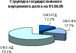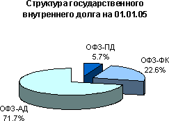 Согласно данным Минфина России, государственный внутренний долг федерального правительства РФ, по состоянию на 1 августа 2005 г. составил 819,827 млрд. руб. Таким образом, внутренний долг с начала года увеличился 63,037 млрд. руб. или 8,3%. В аналогичном периоде предыдущего года внутренний долг федерального правительства увеличился на 50,949 млрд. руб. или 7,7%. Как в абсолютном, так и в относительном выражении наибольший прирост обязательств сложился в секторе облигаций федерального займа с постоянным купонным доходом (ОФЗ-ПД) – 56,642 млрд. руб. или 130,8%, таким образом, объем долга, выраженный данной бумагой составил на начало августа т.г. 99,949 млрд. руб. При этом, объем обязательств в виде ОФЗ с фиксированным доходом (ОФЗ-ФК) снизился с начала года на 26,093 млрд. руб. или 15,2% и составил 145,131 млрд. руб. Обязательства в виде наиболее популярной в настоящее время бумаги с амортизацией основной суммы (ОФЗ-АД) возросли на 32,487 млрд. руб. (5,9%) – до 574,722 млрд. руб.