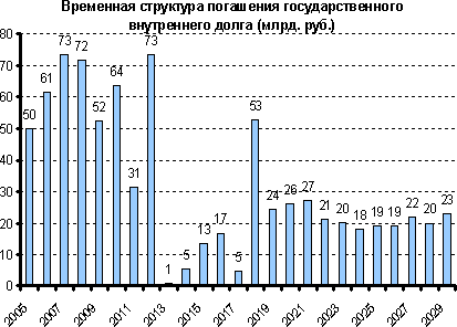 Существенных изменений во временной структуре погашения по-прежнему не происходит. Наиболее значительные погашения произойдут до 2013 года. При этом период с 2013 по 2018 гг. характеризуется невысокими объемами выплат основной суммы внутреннего долга РФ, то есть в настоящее время с точки зрения выравнивания платежного графика целесообразным является выпуск 8-15 летних государственных облигаций. После 2020 г. формируется относительно ровная структура, не предусматривающая периоды пиковых платежей.