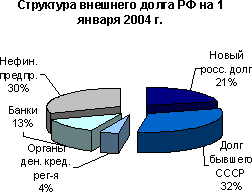 Удельные веса нового российского долга и задолженности бывшего СССР в совокупном объеме внешнего долга по состоянию на 1 января 2005 г. составили 19% и 27% соответственно (21% и 32% в 2004 г.).