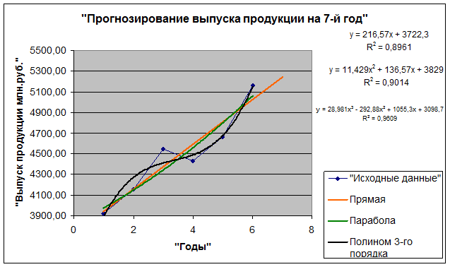Рис.3.1. График динамики выпуска продукции за 6 лет и прогноз выпуска на год вперед