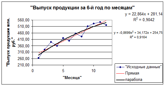 Рис. 3.4. График сглаживания по прямой и параболе ряда динамики выпуска продукции за 6-ой год