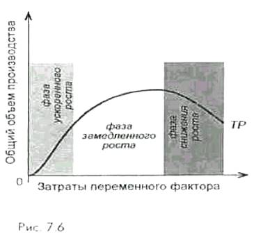 Кривая совокупного продукта показывает, как изменяется вы­пуск продукции при изменении одного из факторов, когда другие остаются постоянными. Кривая проходит три фазы: сначала подни­мается вверх ускоряющимися темпами, затем темп ее возвышения замедляется, наконец, он достигает максимальной точки и начинает снижаться.
