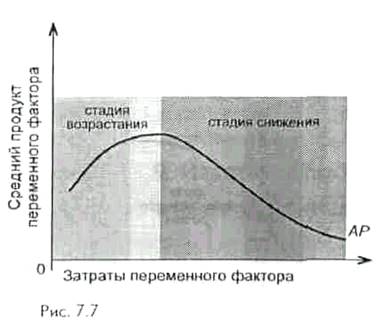 Средний продукт переменного фактора производства —АР (ave­rage product) — показывает отношение совокупного продукта пере­менного фактора к использованному количеству этого фактора. Ре­акцию среднего продукта, или производительности переменного фак­тора, на изменение затрат этого фактора отражает кривая среднего продукта. Для данной кривой характерны как минимум две стадии — стадия возрастания и стадия снижения (рис.7).