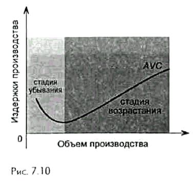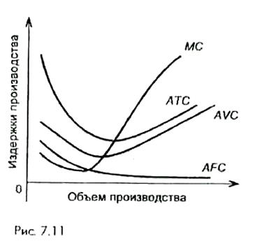 Подобное соотношение предельных и средних издержек предпо­лагает, что если предельные издержки по своей величине ниже сред­них переменных издержек, то кривая средних переменных издержек имеет отрицательный наклон. Когда предельные издержки выше сред­них переменных издержек, кривая последних имеет положительный наклон. То же происходит и с кривой средних общих издержек произ­водства.