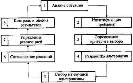 Принятие решения – не одномоментный акт, а результат процесса, имеющего определенную продолжительность и структуру. Процесс принятия решений – циклическая последовательность действий субъекта управления, направленных на разрешение проблем организации и заключающихся в анализе ситуации, генерации альтернатив, выборе из них наилучшей и ее реализации. Одна из сложнейших процедур процесса принятия решения – идентификация решаемой проблемы, поскольку в момент своего возникновения многие важные проблемы слабо структурированы, т.е. не содержат очевидных целей, альтернативных путей их достижения и представлений о затратах и эффекте, связанных с каждым из возможных вариантов. Прежде чем анализировать возможные альтернативы решения, менеджеру необходимо определить показатели, по которым будут сравниваться варианты.