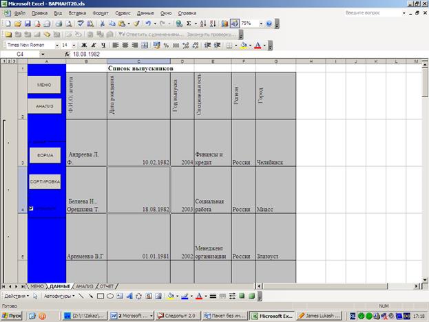 • для накопления и хранения информации используется однотабличная база данных - список MS Excel - лист "Данные";