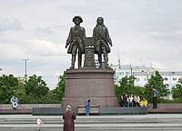 Памятник основателям города, установленный на левом берегу Исети, в том месте, где главная магистраль города — проспект Ленина — проходит по городской плотине. Памятник работы скульптора П. Чусовитинова открыт к 275-летию города, в августе 1998 г., и представляет фигуры отцов-основателей Екатеринбурга — Василия Никитича Татищева и Виллима Ивановича Геннина. Всмотритесь внимательно в их лица — правда, похожи? На сохранившихся портретах двух этих людей тоже можно заметить некоторое сходство: высокие лбы, узкие лица, волевые подбородки, крупные носы. Но по характерам они были скорее противоположностями, и порой кажется, что противоположности эти отцы-основатели привнесли, вольно или невольно, и в характер самого города.